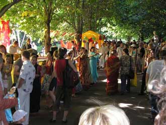 Начало фестиваля приходилось на два часа дня, и к тому времени преданные уже установили небольшую сцену, украсили ее, разместили палатки с атрибутикой, индийским макияжем, столики с прасадом (освященной вегетарианской пищей). Под аккомпанемент звуков различных инструментов, которые настраивали музыканты на главной сцене, преданные подготовились к приему гостей, желающих отведать разнообразный прасад или просто задать вопросы и ознакомится с традиционной вайшнавской культурой.