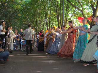 Широкий выбор традиционной одежды - сари, пенджаби, шелковые накидки (чадары), разнообразные украшения, краски, браслеты и ножные колокольчики - все это можно было одеть, примерить и посмотреть, одновременно получив квалифицированную консультацию. Кроме того, наши мастера-вайшнави всем желающим девушкам рисовали живыми красками гопидотс - традиционные украшения на лице.