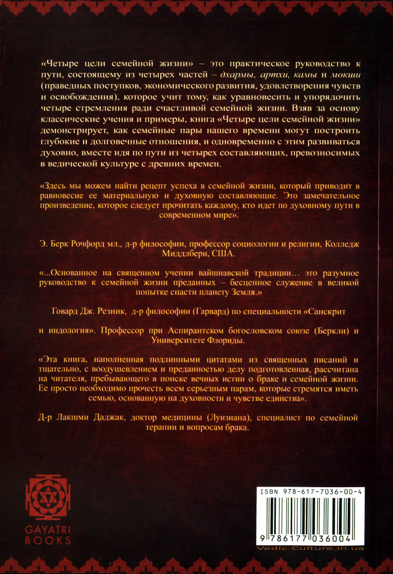 Книга «Четыре цели семейной жизни» демонстрирует, как семейные пары нашего времени могут построить глубокие и долговечные отношения, и одновременно с этим развиваться духовно, вместе идя по пути из четырех составляющих, превозносимых в ведической культуре с древних времен: «дхарма», «артха», «кама» и «мокша» — праведные поступки, экономическое развитие, удовлетворение чувств и освобождение).