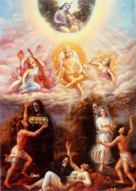 Наука Самоосознания: «Недалекие люди поклоняются полубогам, однако обретаемые ими плоды скудны и преходящи. Те, кто поклоняется полубогам, попадают на планеты полубогов, но те, кто предан Мне, достигают Моей высшей обители»
