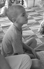 Мне больше всего понравилось в Маяпуре. Каждую субботу маленьких Божеств Радхи-Мадхавы катают по всей территории, и по вечерам я помогал делать янтры. Это такие знаки, которые рисуют на земле разноцветной рисовой мукой, украшают цветами и предлагают Божествам. Потом я ходил за слоном Гулабом, который вез на себе домик с Радхой-Мадхавой. Перед каждой янтрой стояли столики с сюрпризами для Божеств. Слон останавливался и ждал, пока это все предлагалось Радхе с Кришной. Киртаны ежедневные мне нравились..., Божества, особенно, Угра-Нрисимха. Я всегда брал сандал и туласи со стоп Нрисимхадева. Интересно было в Гангу с кораблика прыгать.