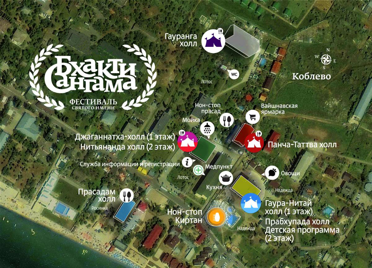Фестиваль «Бхакти-Сангама 2019» будет проходить в Коблево на базах «Лотос», «Надежда», «Бирюза» и «Росинка». Мы договорились с более чем 20 базами, которые способны вместить в себя всех участников фестиваля и с которыми договорились о скидке на проживание на время фестиваля.