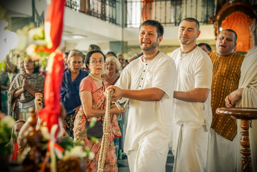 Радхарани села с одной стороны, Кришна — с другой стороны, а все сакхи стали их тихонько раскачивать. Но Кришна постепенно стал раскачивать качели, и раскачал их прямо к небу. Радхарани вскрикнула и бросилась на другую сторону качели прямо к Кришне, а Кришна продолжал качать, и из-за чего всё дерево изогнулось.